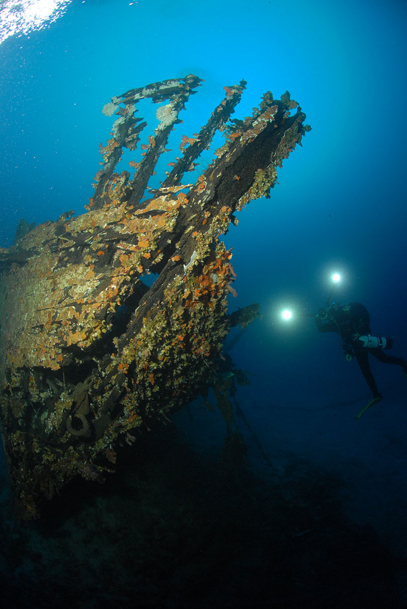 Jego dziób zawadiacko wystaje znad krawędzi uskoku, jakby chciał odpłynąć w toń. Opadam na 55 m pod dziób stateczku i mam nieodparte wrażenie, że za chwilę przepłynie on nade mną, wywołuje to niesamowite doznania.