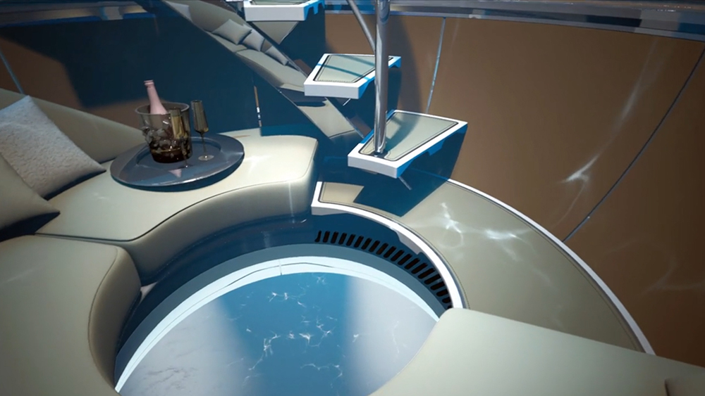 Jednakże Hydrosfera powstała w Gresham Yacht Design, stajni takich innowacyjnych rozwiązań jak 120-metrowy giga jacht o nazwie Emir, z dwupoziomową salą balową i panoramicznymi widokami, czy też 100-metrowy Thor Explore ze szklanymi podłogami, i wnętrzem przypominającym statek kosmiczny.