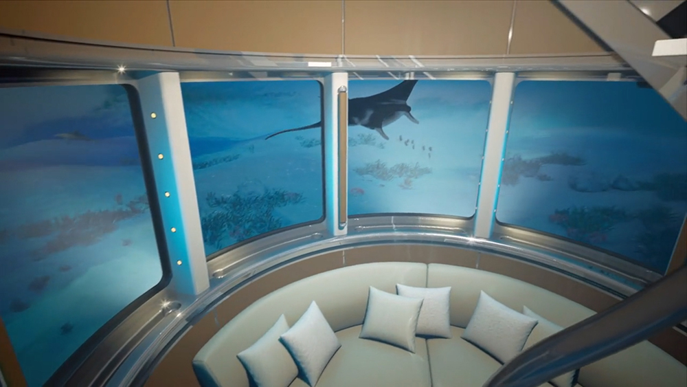Wyposażona w specjalne oświetlenie pokładowe, oświetla zarówno wnętrze, jak i głęboką przestrzeń oceanu. Niezależnie od tego, czy jacht się porusza, czy też stoi „winda” znajdująca się pod pokładem jest w pełni dostępną. Możemy do niej w każdej chwili zejść po schodach lub zjechać wewnętrzną windą. Nieużywana wsuwa się do kadłuba statku, a jego dno zostaje osłonięte zewnętrznym włazem.
