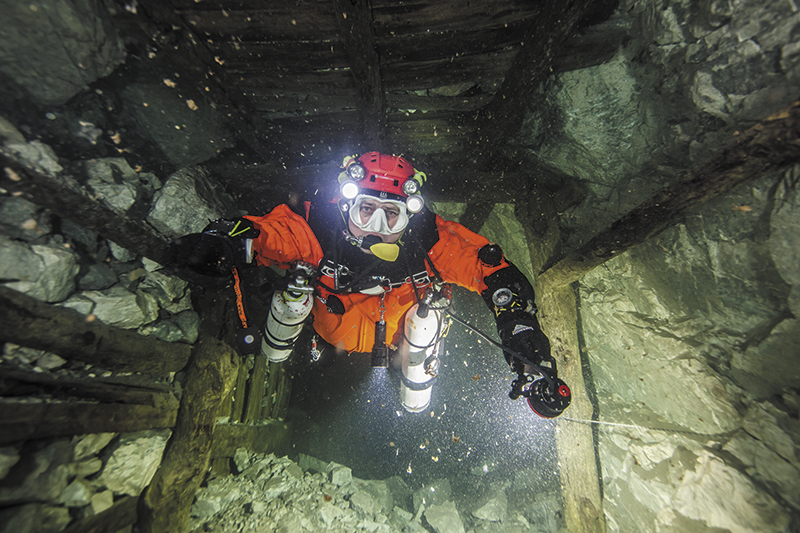 To jest nasz cel – zalany szyb o 24-metrowej głębokości, prowadzący do dwóch poziomów chodników.