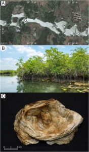 ( C ) Skamieniały okaz ostrygi Crassostrea znaleziony na ilastych osadach dawnego dna laguny, około 10 m n.p.m.